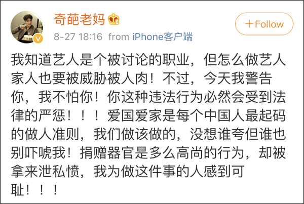 8月27日18時16分,認證為張藝興媽媽的微博用户@奇葩老媽 發博稱: