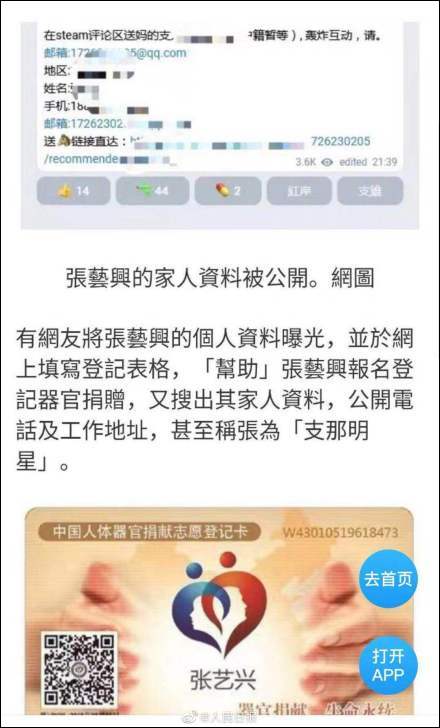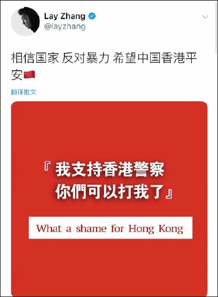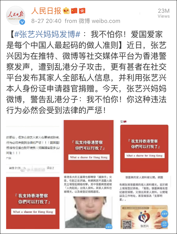 這條微博的起因是,近日,藝人張藝興在微博、推特和Instagram此類社交媒體平台上為香港警察發聲,卻遭到亂港分子攻擊,更有甚者在社交平台發佈其家人全部私人信息,並利用張藝興本人身份證申請器官捐贈。