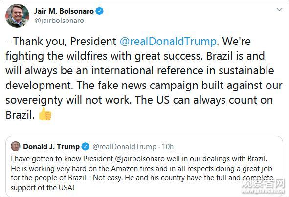 很快,“熱帶特朗普”轉推,並説:“謝謝你,特朗普總統。我們正在與野火搏鬥,取得了巨大的成功。針對我們主權的虛假新聞宣傳不會奏效。巴西可是美國一直指望得上的。”