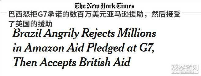 到了27日晚些時候,剛拒絕七國集團幫助的巴西就決定接受來自英國的1200萬美元援助。政府發言人説:“政府強調,所有的外部支持都是受歡迎的,只要由我們決定如何使用這些資源。我們的主權是不容談判的。”據《紐約時報》消息,當天,巴西外長在會議上接受了英國外長的幫助。