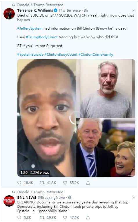 特朗普在愛潑斯坦自殺後,還轉發了一名喜劇演員的推文,將矛頭指向克林頓家族,暗示涉克林頓陰謀論。