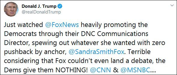 “剛剛看了福克斯新聞,他們大力宣傳民主黨,民主黨全國委員會通訊主任(伊諾霍薩,Xochitl Hinojosa)隨心所欲地暢所欲言,主播桑德拉·史密斯沒給他任何阻力。福克斯沒有辯論的土壤,真糟糕,民主黨啥也沒給他們!”