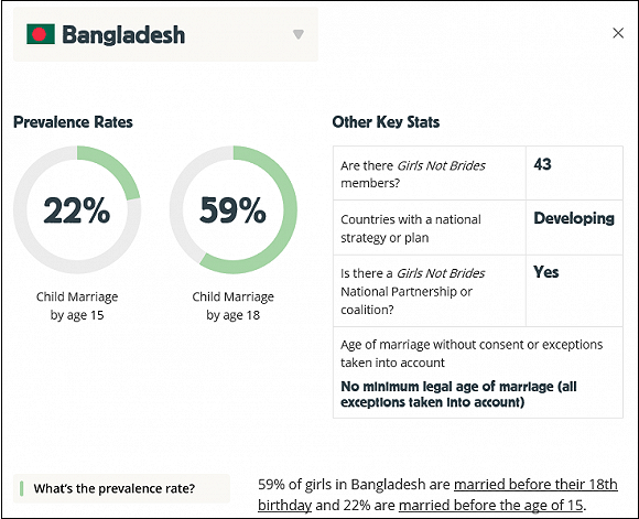 反對女孩童婚的著名援助組織“女孩不是新娘”(Girls Not Brides)的數據顯示,孟加拉國的童婚率在世界上排名第四。有59%的女孩在18歲之前結婚,22%的女孩在15歲之前結婚。