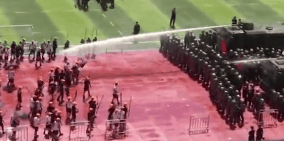 部隊還出動了水炮車驅趕,發射了催淚彈,“拘捕”了部分“暴徒”,最終,成功處置暴力騷亂事件。