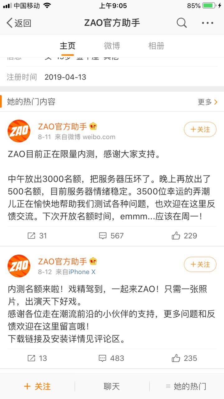 這或許是因為下載太火爆導致的宕機所致。“AI服務器很貴很貴,只希望大家能給五星好評。”據ZAO官方微博介紹,8月11日放出3000內測名額,把服務器壓壞了。這個月(8月份)花700萬租的服務器,昨晚已經消耗了1/3。可見其火爆程度。