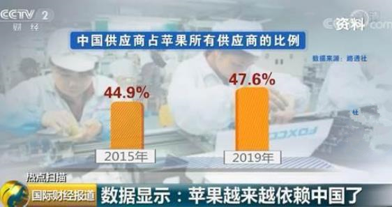 路透社的數據顯示,2015年,中國供應商佔蘋果所有供應商的比例為44.9%;到了2019年,這一比例悄然上升到了47.6%。