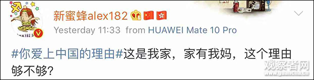 他轉發了人民日報發起的“你愛上中國的理由”話題並談及自己的經歷:曾在英國的殖民土地上出生長大,所受的教育、耳濡目染的都是西方事物,到了國外讀書後,對祖國一度只有“模糊的印象”。