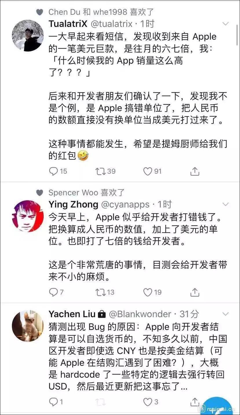 9月4日,有開發者稱一大早起來看短信,發現收到來自蘋果的一筆美元鉅款,金額是往月的六、七倍。後來發現這不是個例,是蘋果公司把人民幣的金額搞錯成美元直接打過來了。