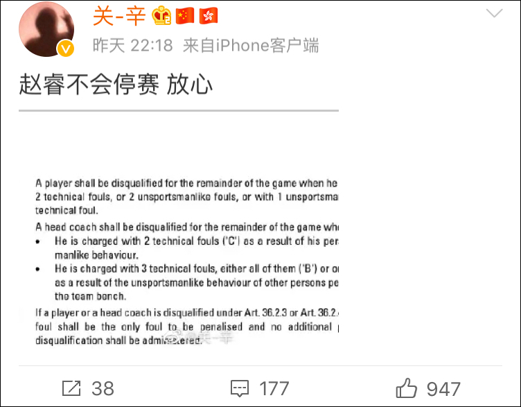 所幸李政鉉後來再次回到場上,最終得到了9分6籃板。趙睿則依舊作為替補奇兵扛起大旗,但因為兩次技術犯規,在末節下半段被罰下。據廣東電視台記者@關-辛 消息,趙睿不會被停賽,依然可以出戰8日對陣尼日利亞的排位賽。
