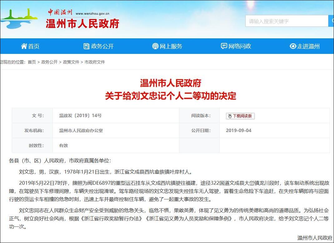 本月3日,温州市政府網站發文決定,給予“飛車俠”劉文忠記個人二等功一次。