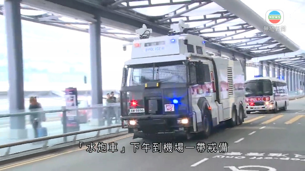 警方水炮車下午到機場一帶戒備,經過客運大樓。