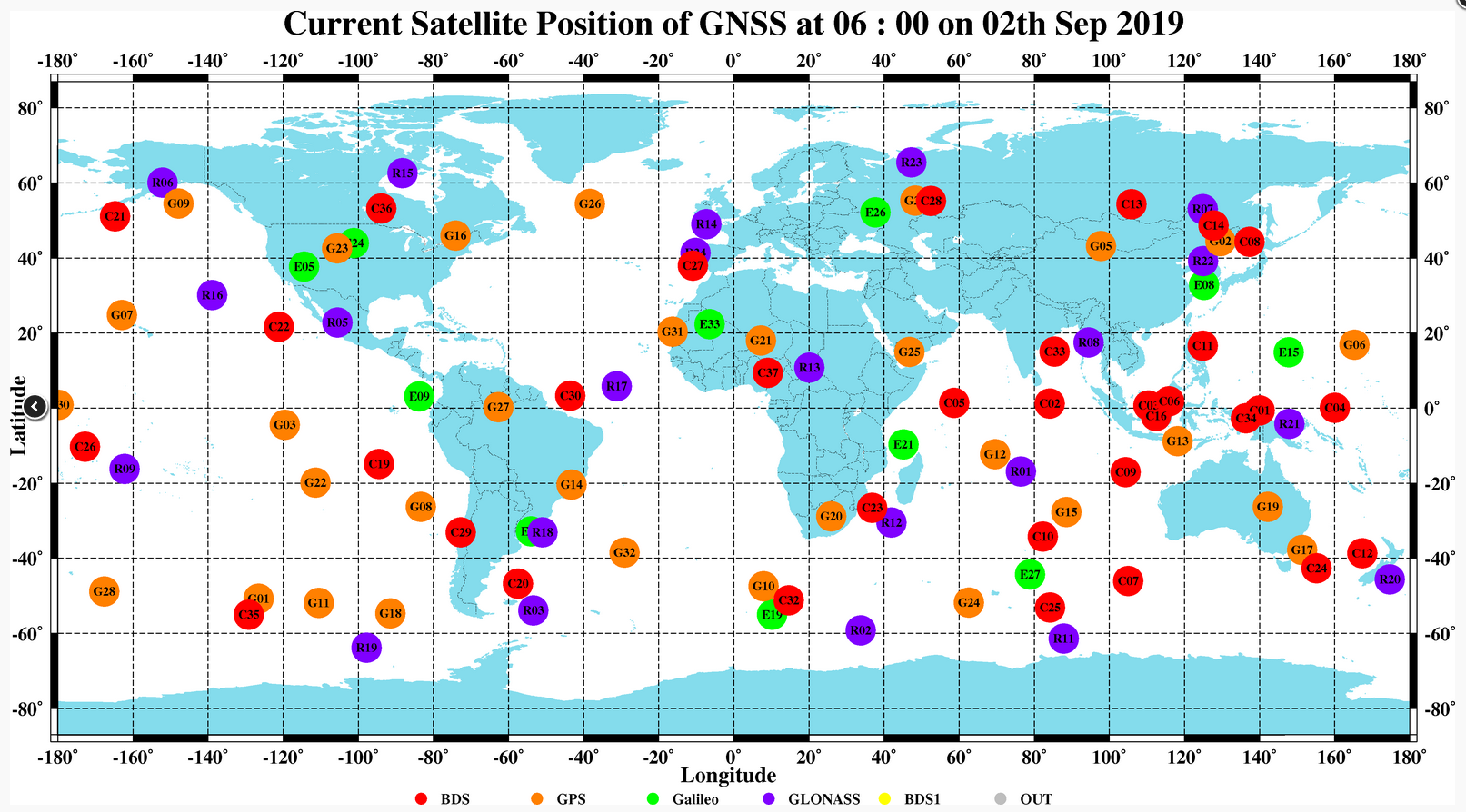 2019年9月2日06時 四大導航系統各自衞星分佈情況