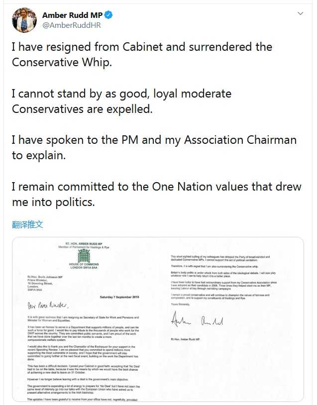 9月7日,在經歷了同僚背叛、兄弟反目、上下兩院“雙錘連擊”後,約翰遜收到了自家就業與養老金大臣安伯·拉德的辭職信。