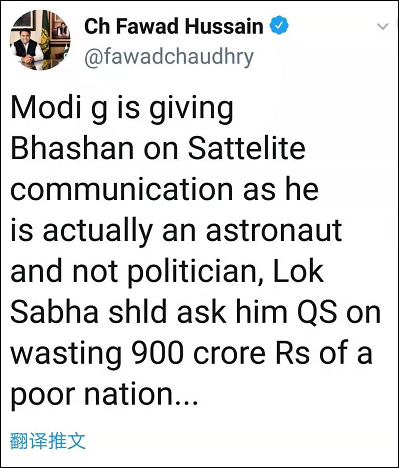 喬杜裏還在一條推文裏提到了印度總理莫迪,稱“莫迪正在就衞星通訊發表演講,好像他是位宇航員而非政治家。”