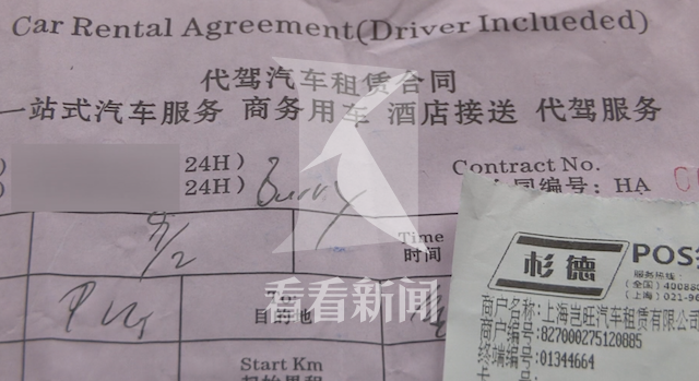 記者看到,POS機刷出來的單據上的公司抬頭是上海豈旺汽車租賃有限公司,但並不清楚這輛奧迪車是否是隸屬於該公司。發票上則寫着“代駕汽車租賃合同,一站式汽車服務、商務用車、酒店接送、代駕服務”等字樣。