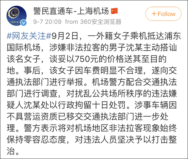 9月7日晚20時左右,@警民直通車—上海機場 發佈消息回應網友關注,經調查,是涉嫌非法拉客的男子沈某主動搭訕該名外籍女子,談妥以750元的價格送其至目的地。事後,該女子因車費明顯不合理,遂向交通執法部門進行舉報。