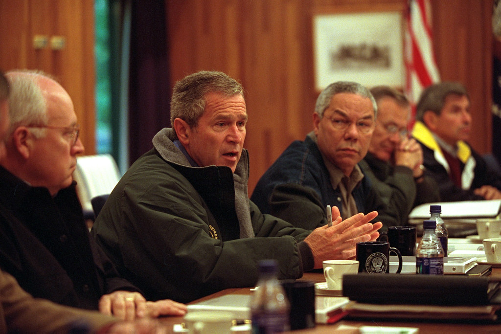 “9·11”襲擊後,時任總統小布什與幕僚在戴維營開會 圖自:美國國家檔案和記錄管理局