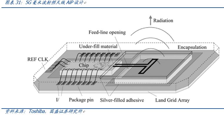 AiP(Antennas in Package)即基於將天線與射頻前端模塊集成在系統級封裝中的封裝工藝。AiP 技術很好地兼顧了天線性能、成本及體積,我們通過三星S10 5G的拆機可以發現,AiP封裝模塊已經正式用於5G手機,在基於高通方案的5G手機中,一共採用了三個基於AiP封裝的高通QTM052模塊,單機封裝價值量進一步提升!