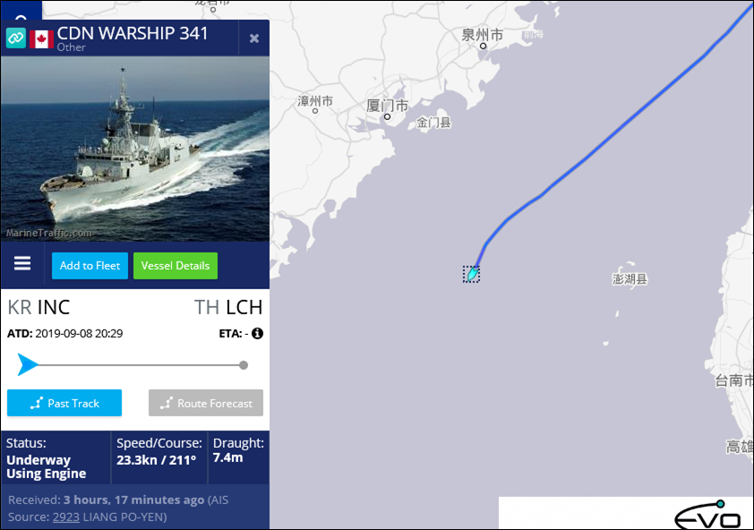 “渥太華”號護衞艦在穿越台灣海峽時,一度打開了AIS(船舶自動識別系統)。