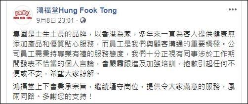 然而,當晚,鴻福堂卻在其Facebook賬號中發佈聲明,稱:“十分重視有同事於工作期間發表不恰當個人言論,會嚴肅跟進及加強培訓,抱歉引起不便或不安。”
