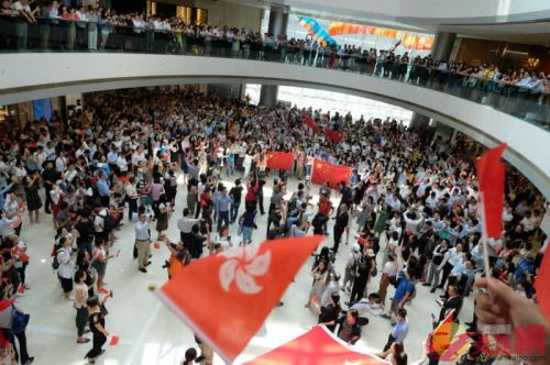 期間,有人從商場二層懸掛出長達6米的國旗,大家一齊高歌,揮舞手中的旗幟,並高呼口號"中國香港加油"。