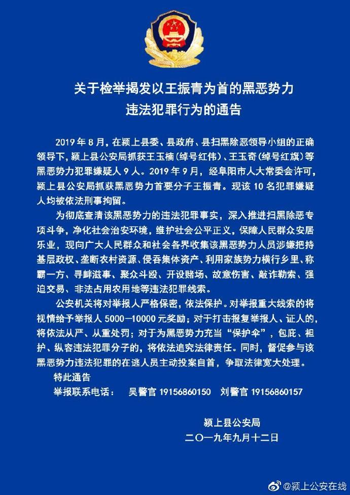 安徽省阜陽市潁上縣公安局官方微博@潁上公安在線 9月12日發佈《關於檢舉揭發以王振青為首的黑惡勢力違法犯罪行為的通告》,稱2019年8月,在潁上縣委、縣政府、縣掃黑除惡領導小組的正確領導下,潁上縣公安局抓獲王玉楠(綽號紅偉)、王玉奇(綽號紅旗)等黑惡勢力犯罪嫌疑人9人。2019年9月,經阜陽市人大常委會許可,潁上縣公安局抓獲黑惡勢力首要分子王振青。現該10名犯罪嫌疑人均被依法刑事拘留。