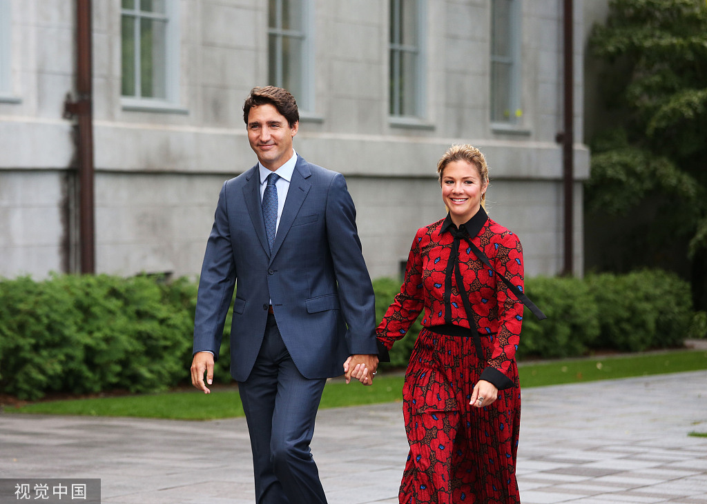 當地時間11日,特魯多及妻子參加競選活動 @視覺中國
