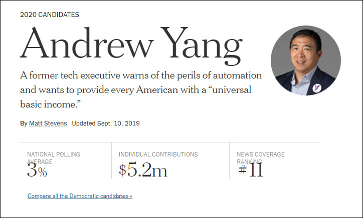 據《紐約時報》的最新統計,楊安澤在美國的平均支持率有3%。當地時間12日,他還將參加民主黨候選人的電視辯論。