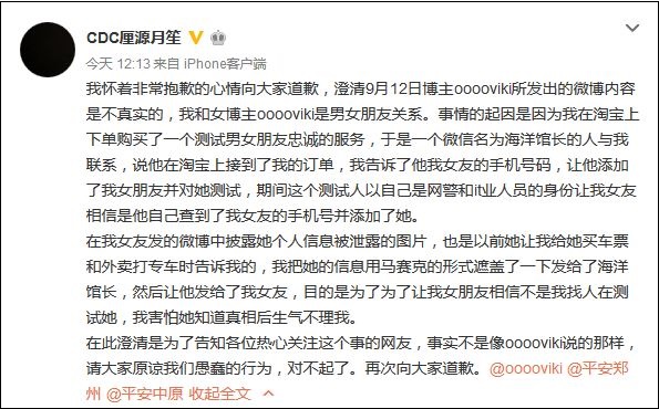 另外,據稱是當事人"ooooviki"男朋友的微博用户“CDC釐源月笙”,也在微博上道歉。