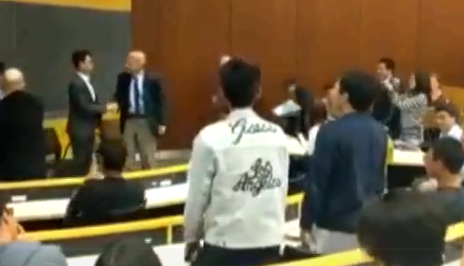 會議結束之時,與會的兩名愛國留學生突然起立,高唱國歌,抗議“港獨”言論。