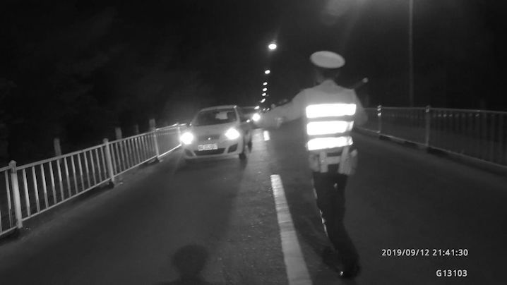9月12日晚上9點40分,金唐交警大隊在大肖線金鼎中學路段開展專項整治。一輛粵AD5××87號白色共享汽車沿着北往南方向行駛,忽然在崗點前不遠處停了下來。一道紅色身影從駕駛座上下來,跑到了後座。
