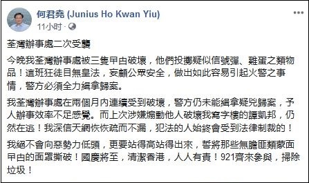 針對14日晚的縱火事件,何君堯在臉書上發表文章,稱暴徒目無法律,妄顧公眾安全,做出如此容易引起火警的事情,警方必須全力緝拿歸案。