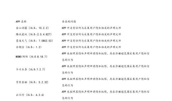 央視新聞客户端消息,9月15日,國家計算機病毒中心發佈了《移動APP違法違規問題及治理舉措》。其中APP和SDK存在的六大類問題,包括遠程控制、惡意扣費等八大類惡意行為、涉嫌侵犯公民個人隱私、涉嫌超範圍採集公民個人隱私等。其中,MOMO陌陌(版本8.18.7)、今日頭條(版本7.2.7)、京東金融 (版本: 5.2.32)、雲閃付(版本: 6.2.6)等下載量很高的應用也名列其中。