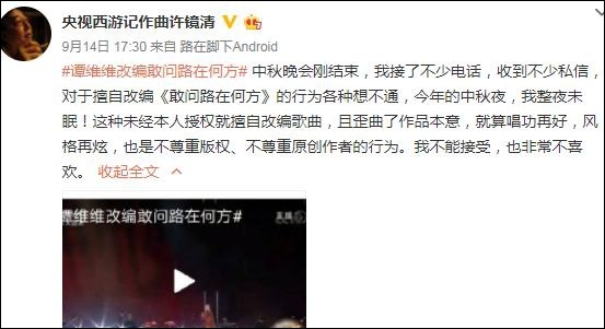 9月13日,央視中秋晚會上,歌手譚維維翻唱的一曲《敢問路在何方》,因大膽改編和風格魔性,引發網友熱議,被批“毀童年”。14日,原作曲家許鏡清發文質問其為何未經授權擅自改編,並在15日再次發文表示“保護中華民族經典是我們每個人的責任”。