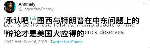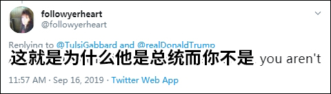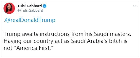 誰知,他這一番安撫加威脅卻先被自己人“打臉”,民主黨總統參選人、眾議員圖西·加巴德在社交媒體上嘲諷:“特朗普在等沙特主子的命令,讓我們的國家扮演沙特的狗腿子可不是‘美國優先’(Having our country act as Saudi Arabia’s bitch is not “America First”)。”