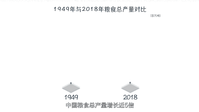 1949年到2018年,中國糧食總產量增長近5倍,人均產量翻一番。