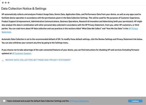 據發現,在惠普打印機的安裝過程中,有一個很難為人注意的“數據蒐集通知與設置”(Data Collection Notice & Settings),惠普在其中聲明會嘗試蒐集用户的相關打印情況,並傳回給惠普,目的是改善廣告、用户體驗。