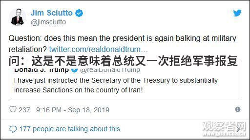 連日來的“口水戰”在週三(9月18日)升級,特朗普一條“剛剛指示財政部長大幅增加對伊朗制裁”的推特,打響了當天各方博弈的“第一炮”。趕赴沙特的國務卿蓬佩奧指責伊朗“戰爭行為”,更是火上澆油。