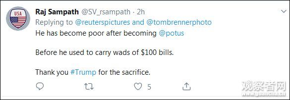 有網友開玩笑説,他當總統後,變窮了。想當年,他兜裏都是放100美元的呢,現在只剩20美元了……