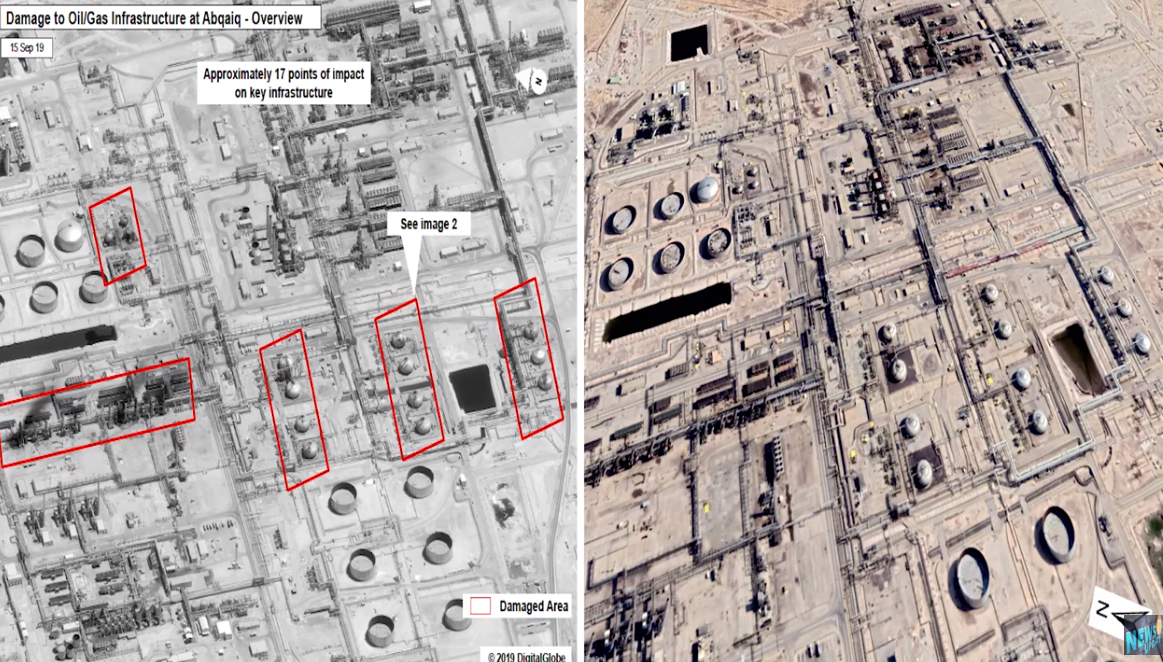 隨後葉海亞准將拿出了胡塞武裝無人機在襲擊前航拍到的沙特石油設施照片。