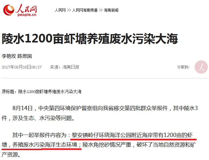 在2017年,海南日報就報道了海南陵水縣1200畝蝦塘養殖廢水污染大海的事件。當時,中央第四環境保護督察組向海南省移交第四批羣眾舉報件。其中一起舉報件內容為:黎安鎮嶺仔環繞海洋公園附近海岸有1200畝的蝦塘,養殖廢水污染海洋生態環境。其後,整改的結果是將蝦塘進行填土平整,恢復原貌。