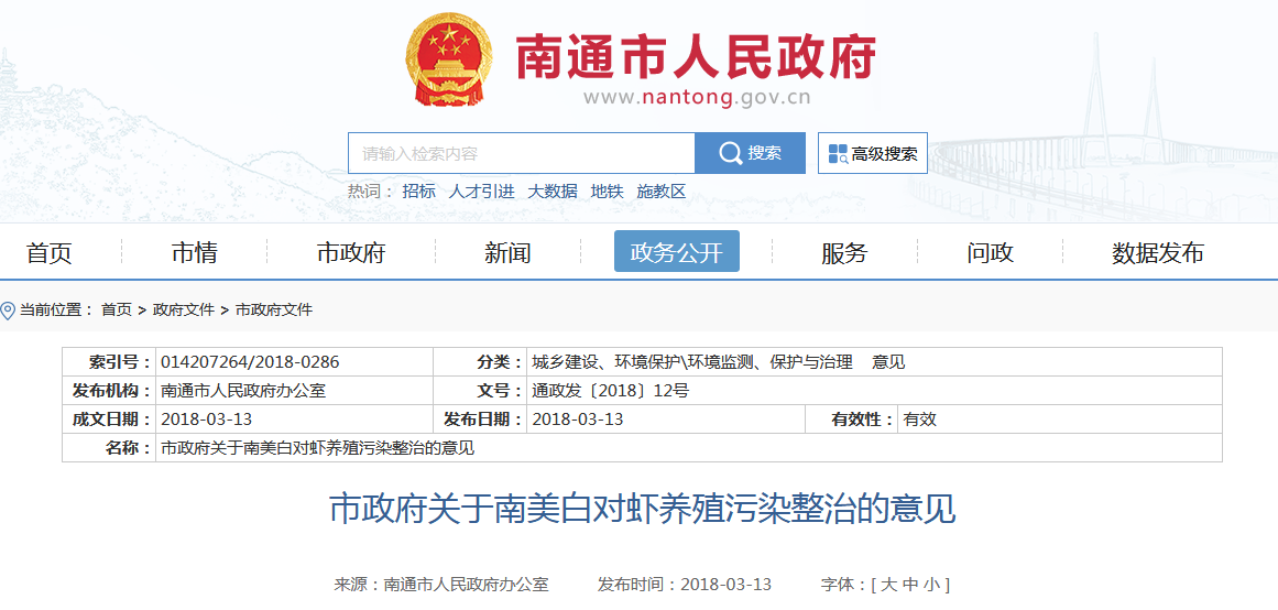 南通市政府關於南美白對蝦養殖污染整治的意見 來源:南通市人民政府官網