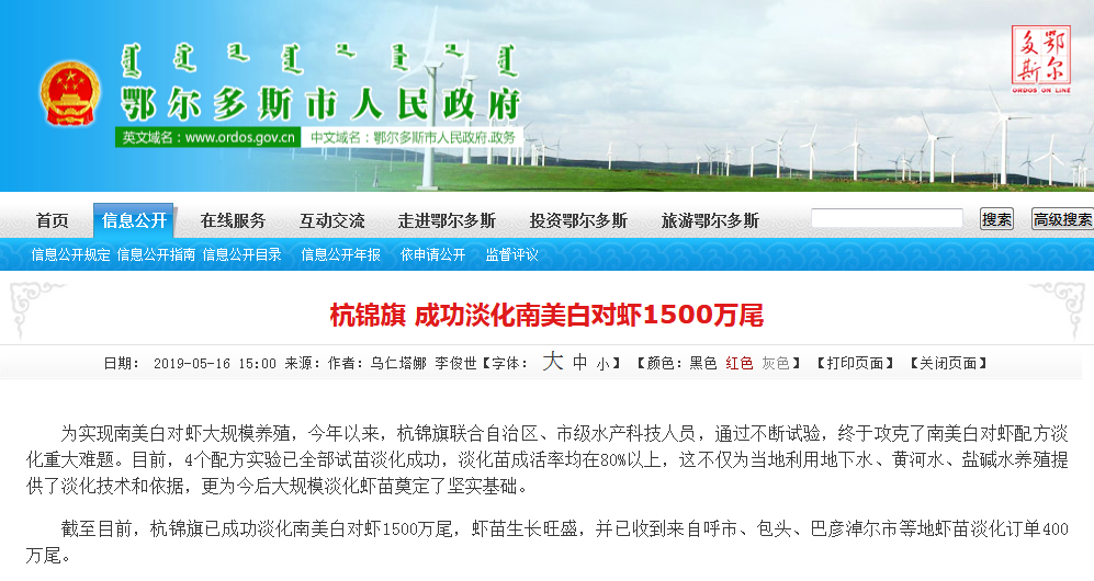 杭錦旗淡化南美白對蝦工作早已開展 來源:鄂爾多斯市人民政府官網
