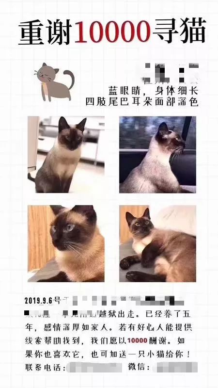 失主在尋貓啓示中説,貓是9月6日在小區13幢附近走丟的。 “已經養了五年,感情深厚如家人,若有好心人能提供線索幫助找到,我們願以10000酬謝,如果你也喜歡它,也可以加送一隻小貓給你!” 並附上了聯繫電話和微信號碼。