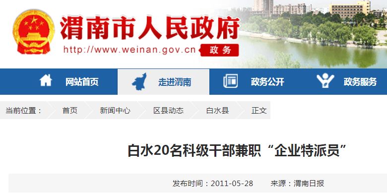 渭南日報2011年報道顯示,陝西省白水縣首批從縣直19個管理部門挑選了20名科級幹部,根據企業需求和幹部職能特長,派駐到20家重點企業、項目。