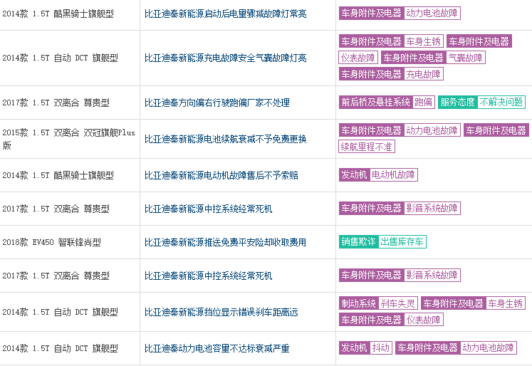 比亞迪秦的主要故障,包括發動機抖動、剎車失靈、電池故障等 數據來源:車質網