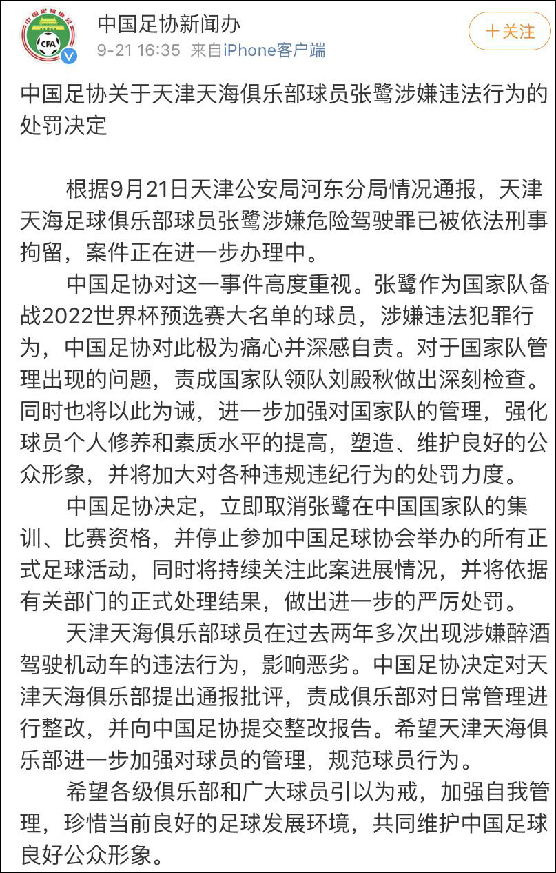 21日下午,中國足協發表聲明,對張鷺作為國家隊備戰2022世界盃預選賽大名單的球員,卻涉嫌違法犯罪行為而表示極為痛心和自責。