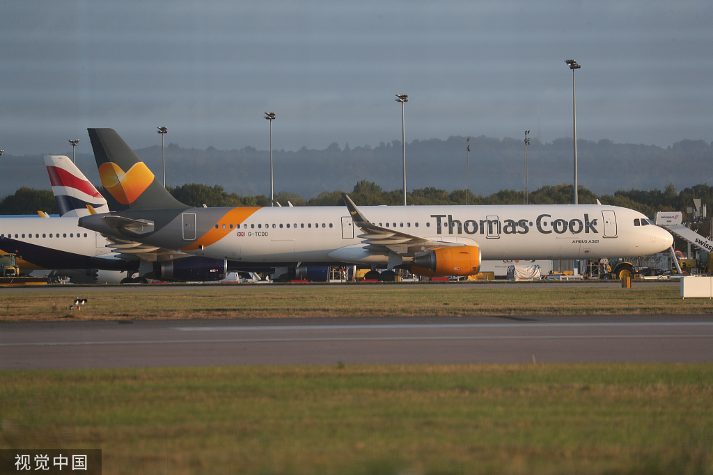 一架托馬斯·庫克集團旗下航空公司的客機停在倫敦蓋威克機場 @視覺中國