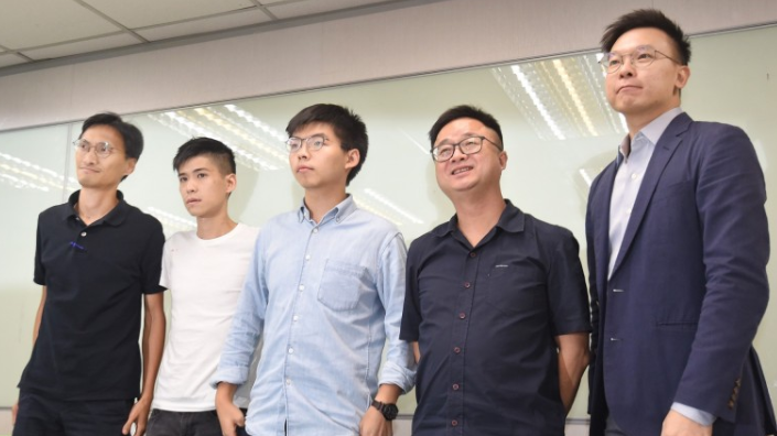 9月3日,香港立法會議員朱凱迪(左起)、學聯前副秘書長岑敖暉、黃之鋒竄訪民進黨黨部,與民進黨秘書長羅文嘉(右二)、副秘書長林飛帆(右一)召開記者會。圖片來自台媒