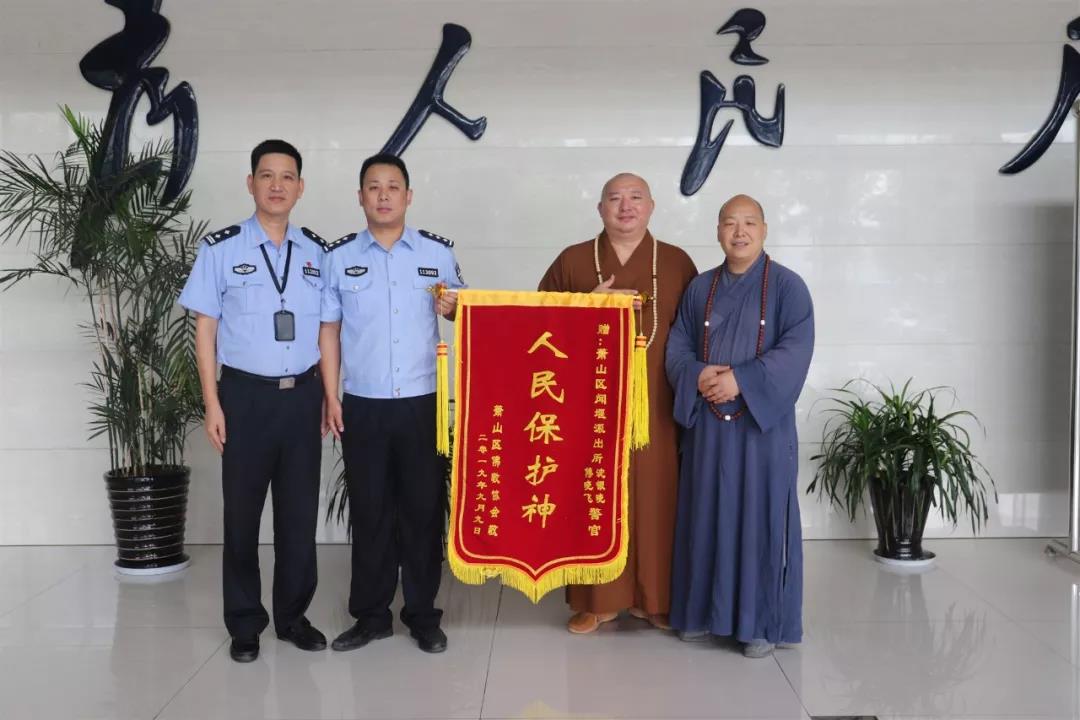 9月12日下午,兩位身穿袈裟的師父走進蕭山聞堰派出所值班大廳,其中一位手中拿着一面寫有“人民保護神”的錦旗。